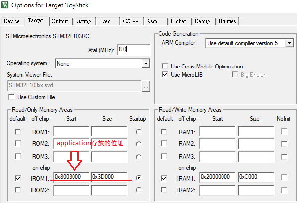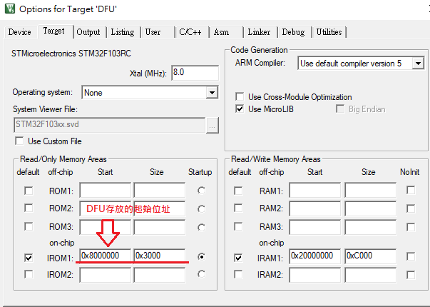 對於 STM32 晶片來說,當電源啟動後,晶片第一執行的位址就是 0x8000000,所以我們把這一小段 DFU 程式安排在這個位址,此時 DFU 內部程式執行後,我們會設計成做個判斷「是否做韌體升級」,如果沒有的話,DFU 會將執行位址跳到 APP 定義的位址,如下圖所示。圖一中,APP 程式碼安排在 0x8003000 位址,這個位址可以自己定義,假如 DFU 程式碼比較大,勢必要將 APP 位址往後移,如果 DFU 程式碼較小,就可以將位址往前移。